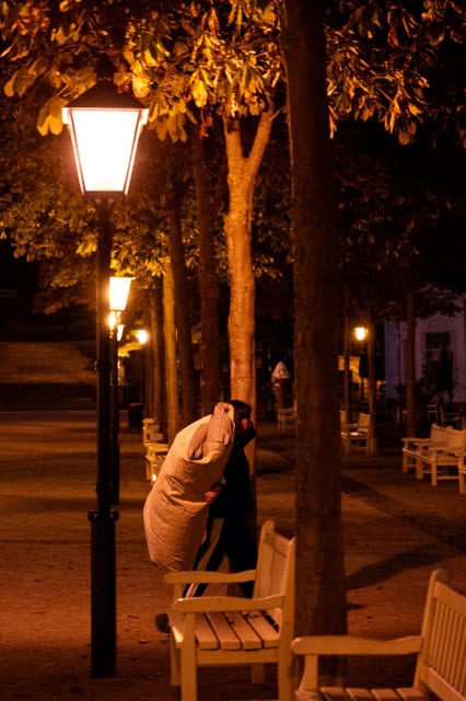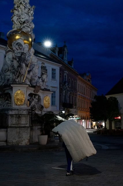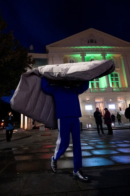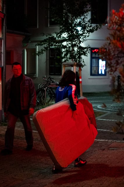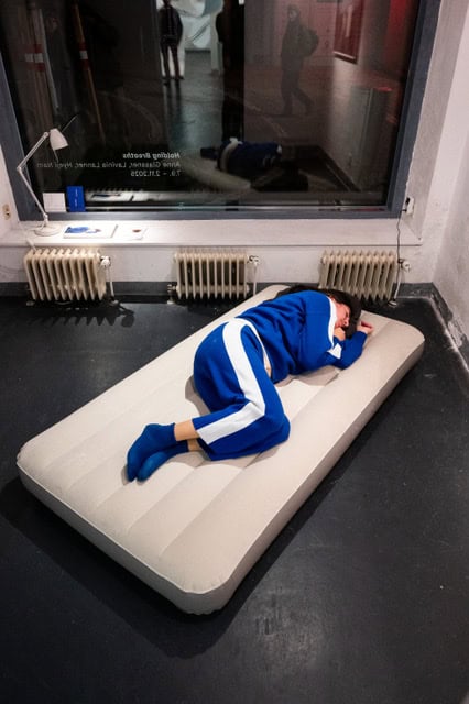 In einem performativem Spaziergang bewegt sich Anne Glassner vom öffentlichen Raum langsam in den Ausstellungsraum, gestärkt von zwei Begleiter*innen: ihrem Atem und einer Luftmatratze. Glassner spaziert wörtlich zwischen Fremd- und Selbstwahrnehmung, indem sie sich in achtsamen Schritten den Übergängen ihrer Bewusstseinszustände hingibt. Der fiktive Dialog mit ihrer Matratze ist dabei mit dem Themenfeld des Schlafens verknüpft, das in seiner Durchlässigkeit auch mit politischen Inhalten – Schlafen als Konsumverweigerung, Schlafen in Sicherheit als Privileg oder der ausbleibende Schlaf helfender, obdachloser, arbeitender oder verletzter Körper – aufgeladen ist. An dieser Schnittstelle zwischen Öffentlichkeit und Intimität lauschen wir also einer Imitation unseres eigenen Atems im Raum, wiedergegeben in Übersetzung der vermeintlich atmenden Luftmatratze. Es ist das Echo einer Verbindung zwischen uns atmenden Wesen und Zeugnis der schwierigen Übung, Atem- und Lebenskontrolle bewusst gehen zu lassen.