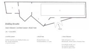 In the exhibition Holding Breaths, the artistic approaches of Anne Glassner, Lavinia Lanner, and Hyeji Nam encounter one another. The three artists share a conceptual and performative practice that directs its attention to the unnoticed yet precious states of in-between, to fleeting forms and subtle moments. Thus, the concept of breath also gains new performative qualities, shifting between mindfulness and boredom, time-tracking and timelessness, disruption and intention.